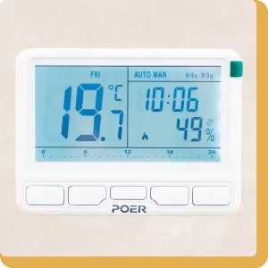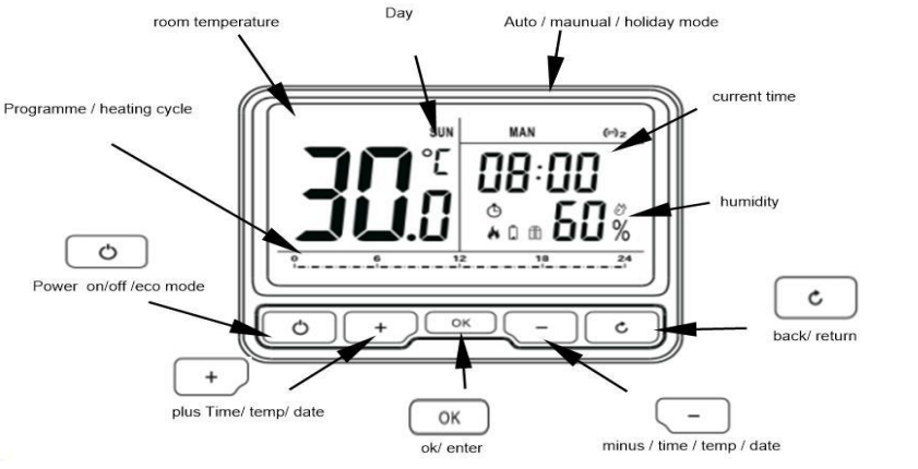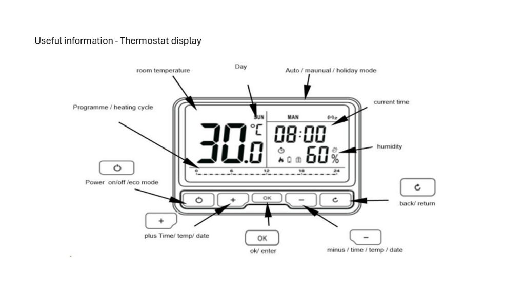 AUTO MAN: Heating is temporarily in ‘boosted’ with the manual mode. The heating will revert to the programmed heating cycle at the start of the next heating period. In this function, the selected temperature will be maintained until the start of the next heating cycle, where the temperature will return to the programmed temperature pre-set in the heating cycle. To access the AUTO MAN mode, press the plus +/- buttons to increase/decrease heating to the desired temperature.